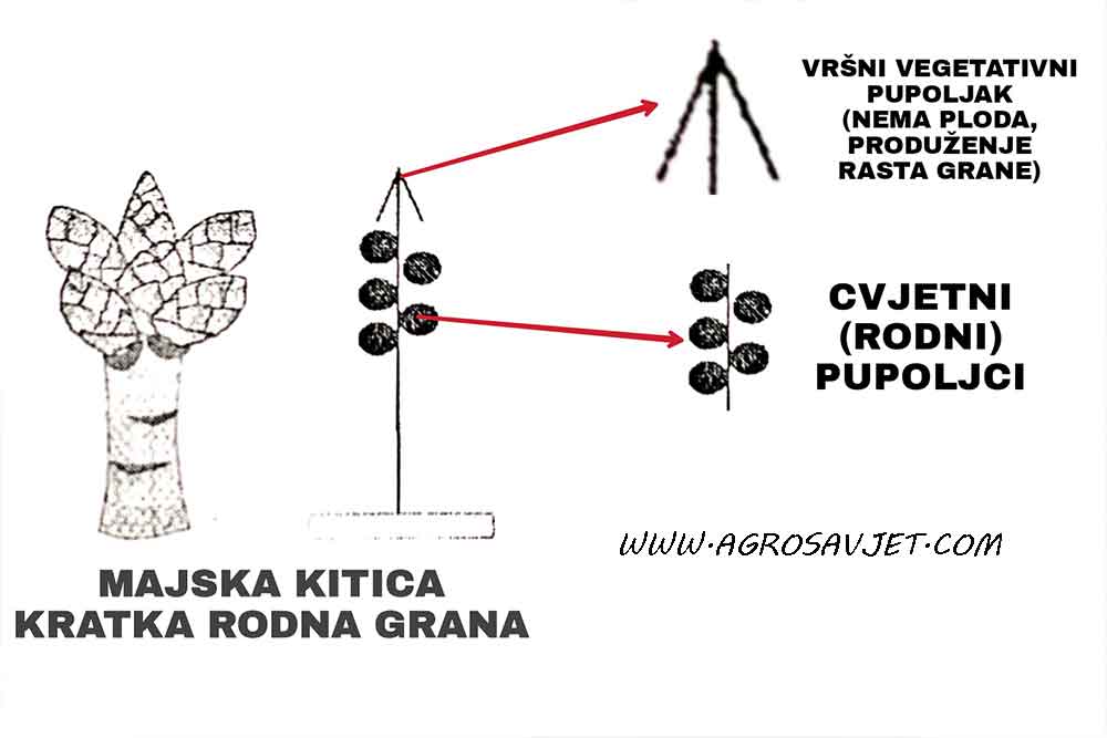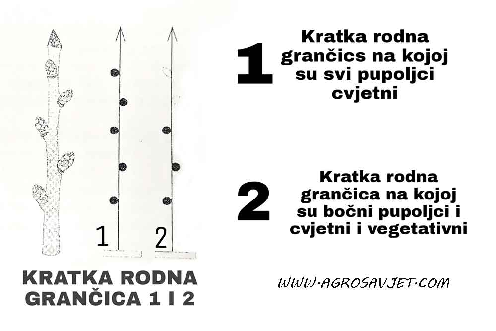 Zajednička karakteristika rodnih grančica koštičavih voćaka je da na vrhu imaju vegetativni pupoljak koji svojim razvojem obezbjeđuju produženje rasta grane.