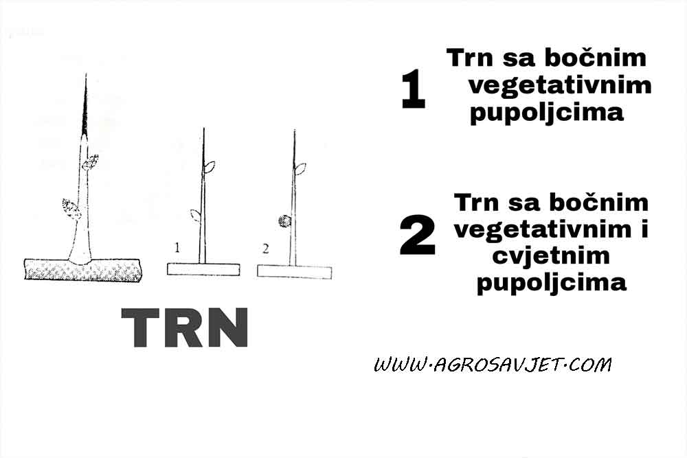 Trn je kratki prirast sa odrvenelim vrhom. On na vrhu nema vegetativni pupoljak, jer je isti odrveneo i transforimisao se u bodlju (trn). Zbog toga on ne produžava rast vrhom, nego ostaje kao kratko zadebljanje, dužine 1,5-3 cm koji postrano ima 1-2 pupoljka. Iz ovih bočnih pupoljaka stvaraju se kraći prirasti koji na sebi nose cvjetne pupoljke.