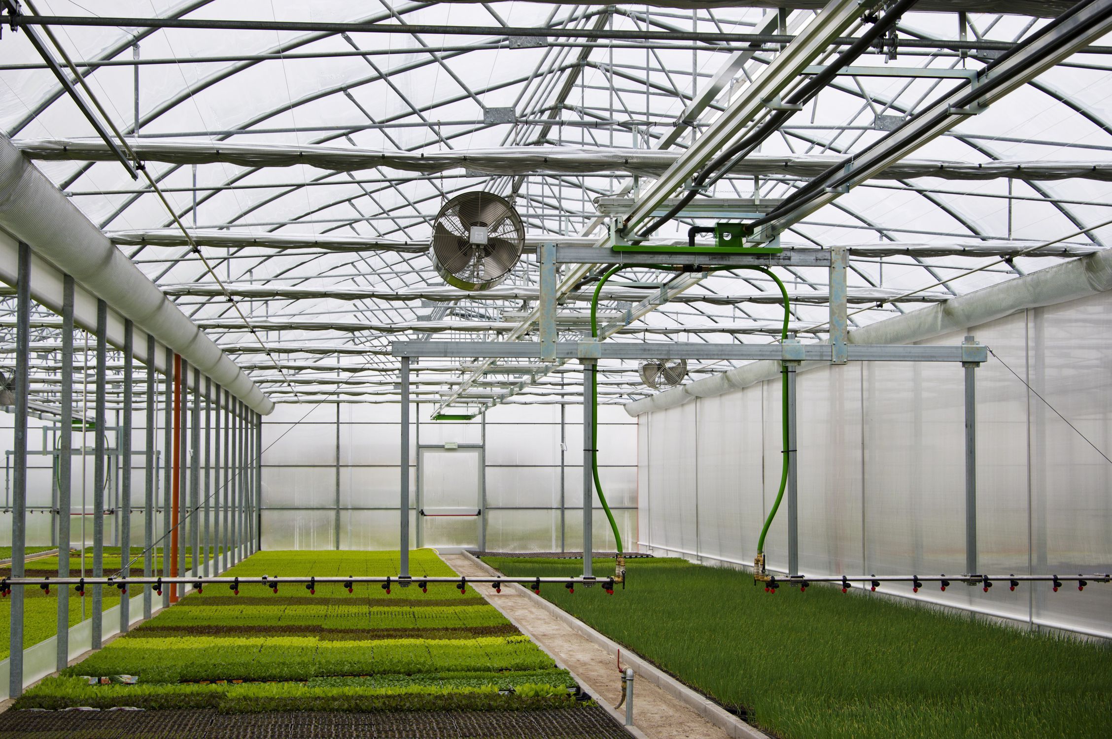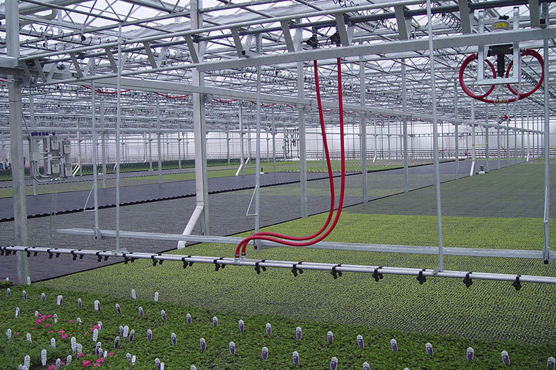 Sistem za navodnjavanje čine centralni vod, razvodne cevi (čelične, pocinkovane, plastične) različitog prečnika i dužine, postavljenih u objektima, i rasprskivači (dovode vodu do biljke). U zavisnosti od pritiska (2—4 atmosfere) i razmeštaja raspiskivača, različite su površine koje obuhvata jedan rasprskivač, a od toga zavisi l trajanje rasprskivanja. Ovim sistemom se može zalivati iznad površine zemljišta ili iznad biljaka. Kod površinskog zalivanja cevi se postavljaju između biljaka (na razmaku od 1 m) duž (po sredini ili na dve ivice) leja (5-10 cm iznad zemljišta), vodeći računa da mini rasprskivači zahvataju ukupnu površinu leja. Najčešće se koriste raspiskivači manjeg kapaciteta (4 mm na sat). Sistem je povoljan jer ne kvasi biljke, pa je i manja opasnost od oboljenja, a biljke su ravnomemo zalivene. Pri zalivanju odozgo, cevi i rasprskivači su iznad leja na visini 1-1,5 m (zavisno od visine objekta i vrste koja se gaji) i na razmaku od oko 1,5 m (obavezno pričvršćeni za konstrukciju objekta).